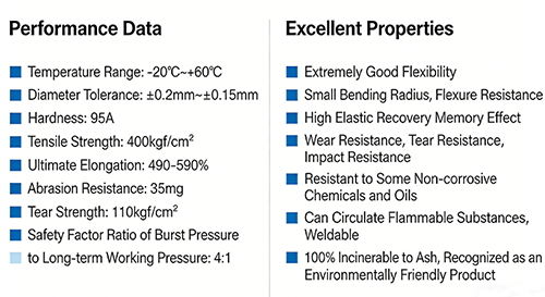 동시에 제품의 경도는 95A, 인장강도는 400kgf/cm², 파단신율은 490%-590%, 인열강도는 110kgf/cm²로 지지력뿐만 아니라 유연성도 우수합니다. 사용 중에 잦은 구부림과 당김을 견딜 수 있어 제품의 내구성이 더욱 향상되어 제품의 수명이 크게 연장됩니다.