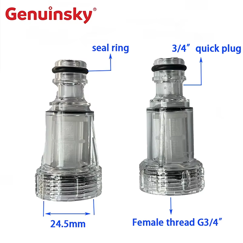 Genuinsky의 흡입 된 물 필터, 제품의 한쪽 끝은 씰 링이있는 3/4 "빠른 플러그입니다. 다른 쪽 끝은 직경이 24.5mm 인 암 스레드 G3/4"입니다.