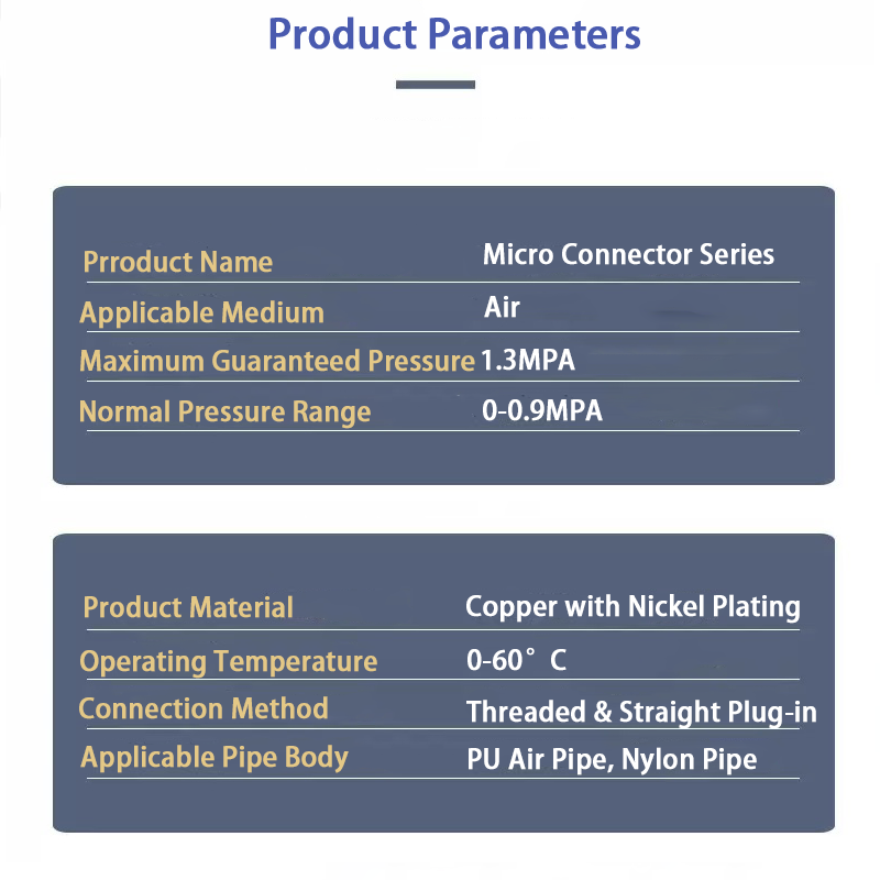 마이크로 미니 커넥터 시리즈 자체의 허용 범위는 0~60°C의 온도 범위입니다. 또한 최대 보장 압력은 1.32MPa에 도달할 수 있으며 정상 작동 압력 범위는 0~0.9MPa입니다. 이는 공압 공구, 자동화 실린더 및 고압 작업 조건이 필요한 기타 장비의 안정적인 작동을 완전히 포괄합니다. 마이크로 미니 커넥터 시리즈의 설계는 산업 운영 요구 사항을 정확하게 충족할 수 있으며 시중의 주류 튜브인 PU 기관 및 나일론 튜브에 적용할 수 있습니다. 이 시리즈 제품의 디자인은 우수한 밀봉 기능을 제공합니다. 제품의 전체적인 디자인으로 볼 때 조인트 재질은 니켈 도금된 구리 밸브 몸체로 만들어졌습니다. 니켈 도금된 구리 소재는 구리 소재의 밀봉성이 우수할 뿐만 아니라 니켈 도금층의 내식성도 우수하여 습기나 먼지가 많은 환경에서도 장시간 작업을 유지할 수 있습니다. 작업의 안정성은 녹슬기 쉽지 않아 연결의 안정성에 영향을 미칩니다. 내부는 접촉 면적이 더 큰 특수 오목형 밀봉 링을 채택하여 밀착성이 더 높고 밀봉이 더 강합니다. 동시에 제품 자체는 일반 산업용 스레드의 표준 R 스레드로 설계되었습니다. 동시에 표준 R 스레드와 내부 잠금 스프링의 조합은 부품 풀림으로 인한 마모 및 누출을 방지하여 밀봉 작업에 이중 보호를 추가할 수 있으며 이는 또한 제품의 서비스 수명이 크게 연장된다는 것을 의미합니다. 마지막으로 마이크로 미니 커넥터 시리즈의 나사산은 PTFE 접착제로 사전 코팅되어 있습니다. 테트라플루오로에틸렌 소재 자체는 매우 우수한 화학적 안정성과 특정 윤활성을 갖고 있어 나사산의 밀봉 효과를 최적화할 수 있을 뿐만 아니라 어느 정도 감소시킬 수 있습니다. 실 마모가 적고 제품의 수명이 더욱 연장됩니다. 소재부터 디자인까지 마이크로 미니 커넥터 시리즈는 우수한 밀봉을 달성하여 공압 시스템의 고압 작동 조건에서 고주파 작업에서도 "방적" 밀봉 효과를 유지할 수 있습니다.