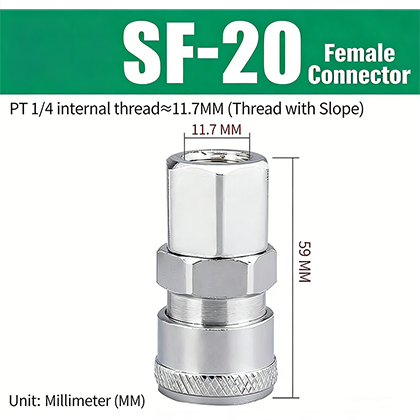 Genuinsky의 PF-SF 시리즈 C형 퀵 커플링(JIS PT 스레드 포함)은 C형 퀵 연결 구조를 갖추고 있어 수 커넥터와 암 커넥터를 자유롭게 쌍으로 연결할 수 있습니다. 전기 도금된 표면과 구리 밸브 코어는 제품의 내구성을 향상시킵니다. 공압 도구 액세서리의 중국 전문 공급업체인 Genuinsky는 표준화를 완벽하게 준수하여 제품을 생산합니다. 이 시리즈는 완벽한 사양 범위를 제공하므로 다양한 공압 파이프라인과 정확하게 일치할 수 있습니다.