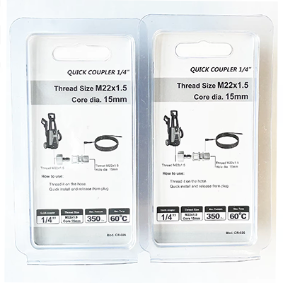 이 두 사양의 1/4 커플러는 크기 디자인이 다릅니다. 하나는 M22×1.5이며 직경이 22mm이고 코어 직경이 15mm입니다. 다른 하나는 M14×1.5로 직경이 14mm이고 테이퍼 구멍이 있습니다. 두 가지 크기의 제품 설계는 매우 정밀하여 관련 청소 기계에 정확하게 적용할 수 있고 고압 세척 건 호스 커넥터에 사용할 수 있습니다. 제품 자체의 재질은 황동입니다. 황동 소재는 내식성이 좋습니다. 고압 청소 작업은 종종 습한 환경에 직면해야 합니다. 따라서 제품 자체의 내식성은 여러 가혹한 작업 환경에서도 정상적으로 작동할 수 있습니다. 동시에 황동은 연성과 경도가 좋으며, 고압의 물 흐름에서도 제품 자체의 내구성이 충격에도 유지될 수 있고 쉽게 깨지지 않아 누수가 발생하고 장비 교체 비용이 절감됩니다. 일반적인 사용 시나리오에는 가정 청소, 산업 장비 청소 또는 실외 시설 청소가 포함됩니다. 이러한 청소 과정에서 설치 또는 분해가 신속하게 수행될 수 있습니다. 사용자는 도구의 도움 없이 연결 작업을 신속하게 완료할 수 있어 작업 효율성이 크게 향상되고 시간이 절약됩니다. 동시에 이 두 사양의 1/4 커플러 크기도 매우 적합합니다. 사용자는 한 손으로 쉽고 유연하게 연결 작업을 완료할 수 있습니다.